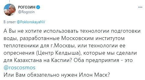 "А вы не хотите использовать технологии подготовки воды, разработанные Московским институтом теплотехники для Москвы или технологии ее опреснения (Центр Келдыша), которые мы сделали для Казахстана на Каспии? Оба предприятия – это "Роскосмос". Или вам обязательно нужен Илон Маск?" – написал глава компании.