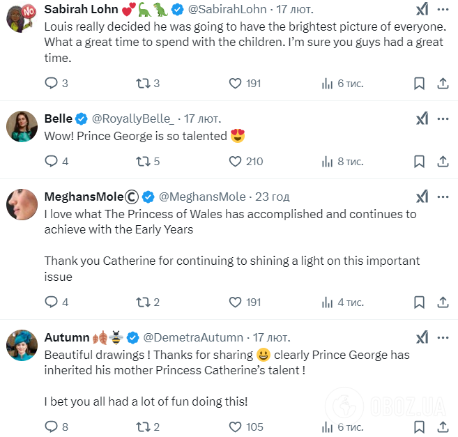 - "Прекрасные рисунки! Спасибо, что поделились. Очевидно, что принц Джордж унаследовал талант своей матери принцессы Кейт!"