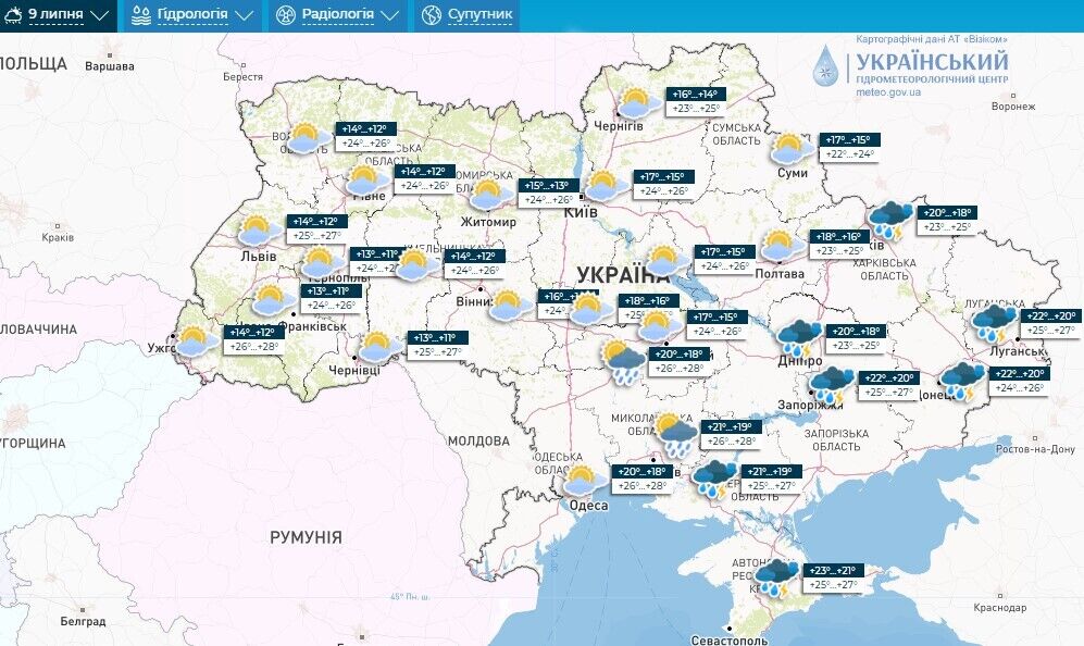 У неділю, 9 липня, по всій території України температура повітря майже зрівняється. Так, на заході трішки потепліє, водночас у східних областях спаде спека — в середньому очікується +24…+27 градусів.